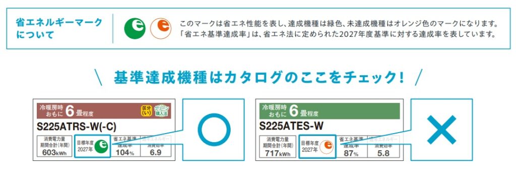 エアコンを選ぶ際、性能表示にある省エネルギーマークの色に注目してください。